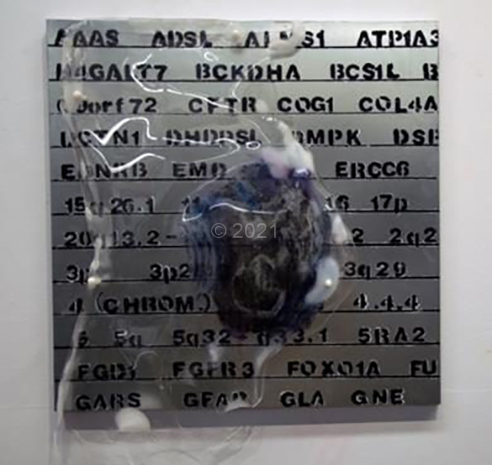 Comments on medicalized pregnancy as a form of eugenics. The letters and numbers are various genetic codes of diseases and syndromes. These replace the ABC song once sung by parents to their young children.